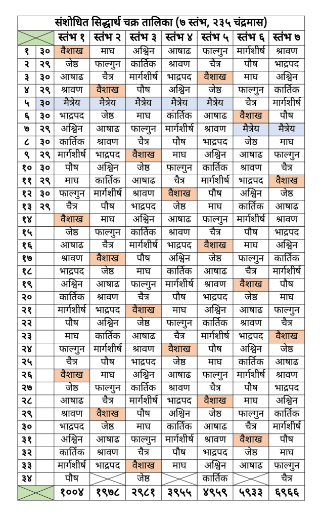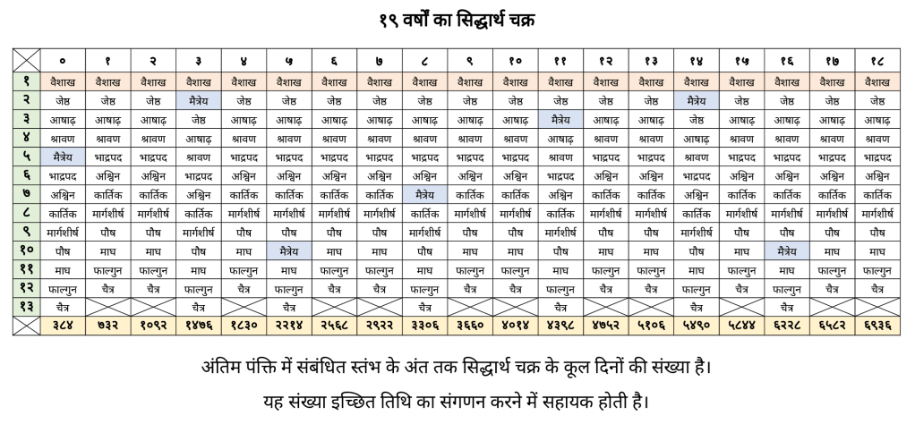 भारतिय बौद्ध चान्द्र-सौर कालगणन प्रणालि १९ सौर वर्ष मे २३५ चन्द्रमास होते है इस वैज्ञानिक तथ्यपर आधारीत है। इस में राशी-नक्षत्रों का कोई संबंध नही है। १९ वर्ष में १९ x १२ = २२८ चन्द्रमास होने चाहिये। परंतु प्रत्यक्ष अवलोकन के पश्चात यह जान पडता है की १९ सौर वर्ष में २३५ चन्द्रमास होते है। अतः इन ७ अधिक चन्द्रमासों को सही सम्मिलित करने के लिये ७ स्तंभोकी एक तालिका बनाते है। इस तालिका के स्तंभो में क्रमशः ३४, ३३, ३४, ३३, ३४, ३३, ३४ खाने बनाते है। हर एक स्तंभ मे एक खाना अधिक चन्द्रमास का होगा। इस अधिक चन्द्रमास को “मैत्रेय” मास कहा जायेगा। यह तालिका सिद्धार्थ चक्र तालिका को कहा जायेगा। यह तालिका निम्न अनुसार होगी।