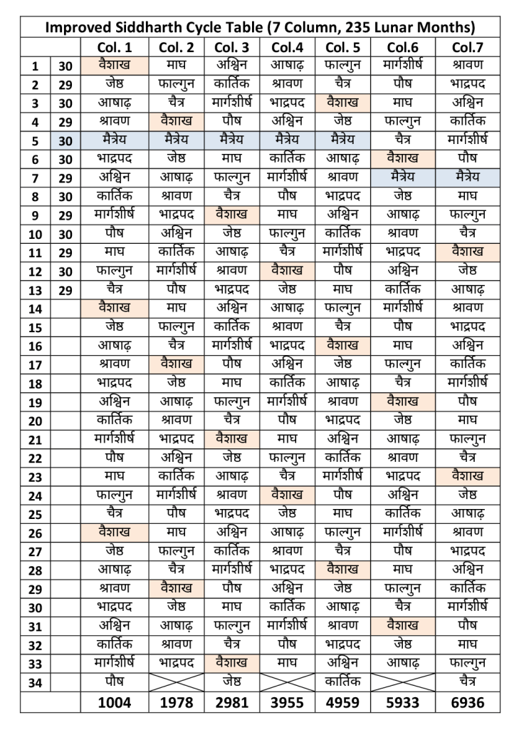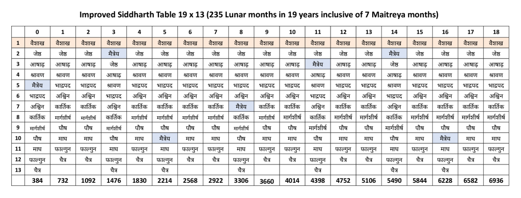 This Calender system is based on 19 years Metonic cycle, specially modified and it is called Siddharth Chakra. Below is the table of this Improvd Siddharth Cycle Table comprising 235 Lunar months in 7 Columns. Every column contains one extra month called “Maitreya” i.e. मैत्रेय.